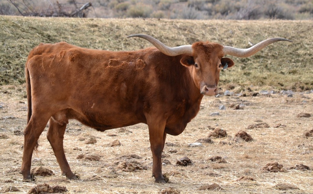 Ella has a gorgeous set of twisted horns. the kind that just add so much character to the breed. She has a large frame and raises a big calf. Her last 5 Calves have been heifers by 3 different sires...so I would say SHE is a GREAT producer! I am keeping her last 2 heifers and she is bred back to Star Enforcer My Bronze winning Bull out of Star Creek Program
